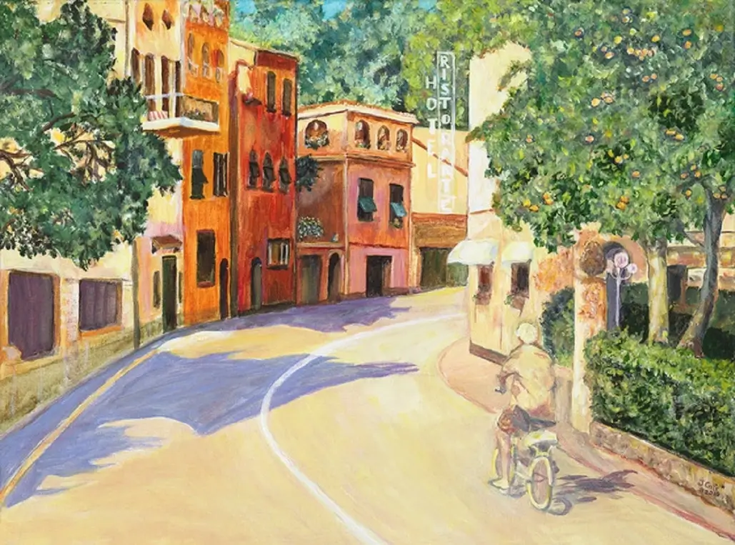 Since light is necessary for us to see colors, I strive to “highlight” it – make it brighter – while emphasizing the shadows in contrast. To facilitate this process, I often use Photoshop on my MacBook Air to boost the colors of my photo. Painting from this more vibrant photo makes a painting livelier and more interesting by capturing more of the essence of actual sunlit colors. Exaggeration of color and “motion” lines also help translate a real scene onto a two-dimensional surface without looking flat or stilted.