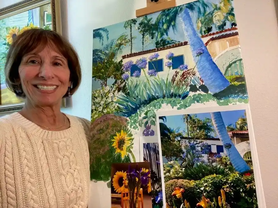 Below you see me at my easel with a painting in progress. You can see that I am using not just one, but several photos to create the painting. I often use several photos for a single painting.